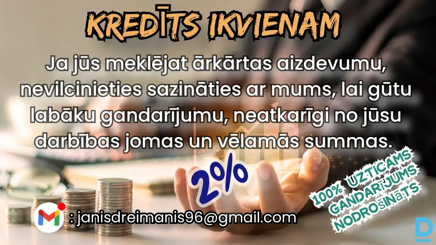 Sveiki !! Ja jūs meklējat ārkārtas un ātro kredītu, nevilcinieties sazināties ar mums, lai iegūtu labāku apmierinātību neatkarīgi no jūsu darbības jomas un vēlamās summas. ? WhatsApp: +371 20 232 245 |